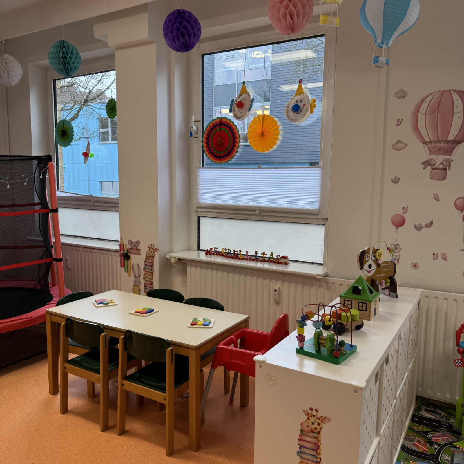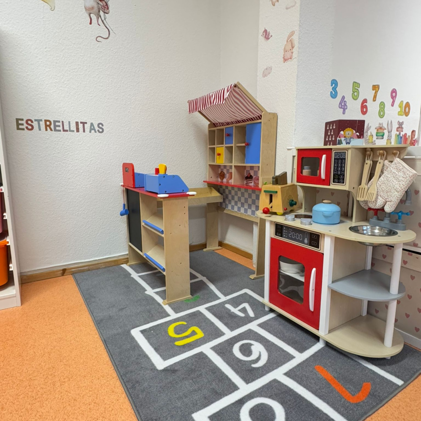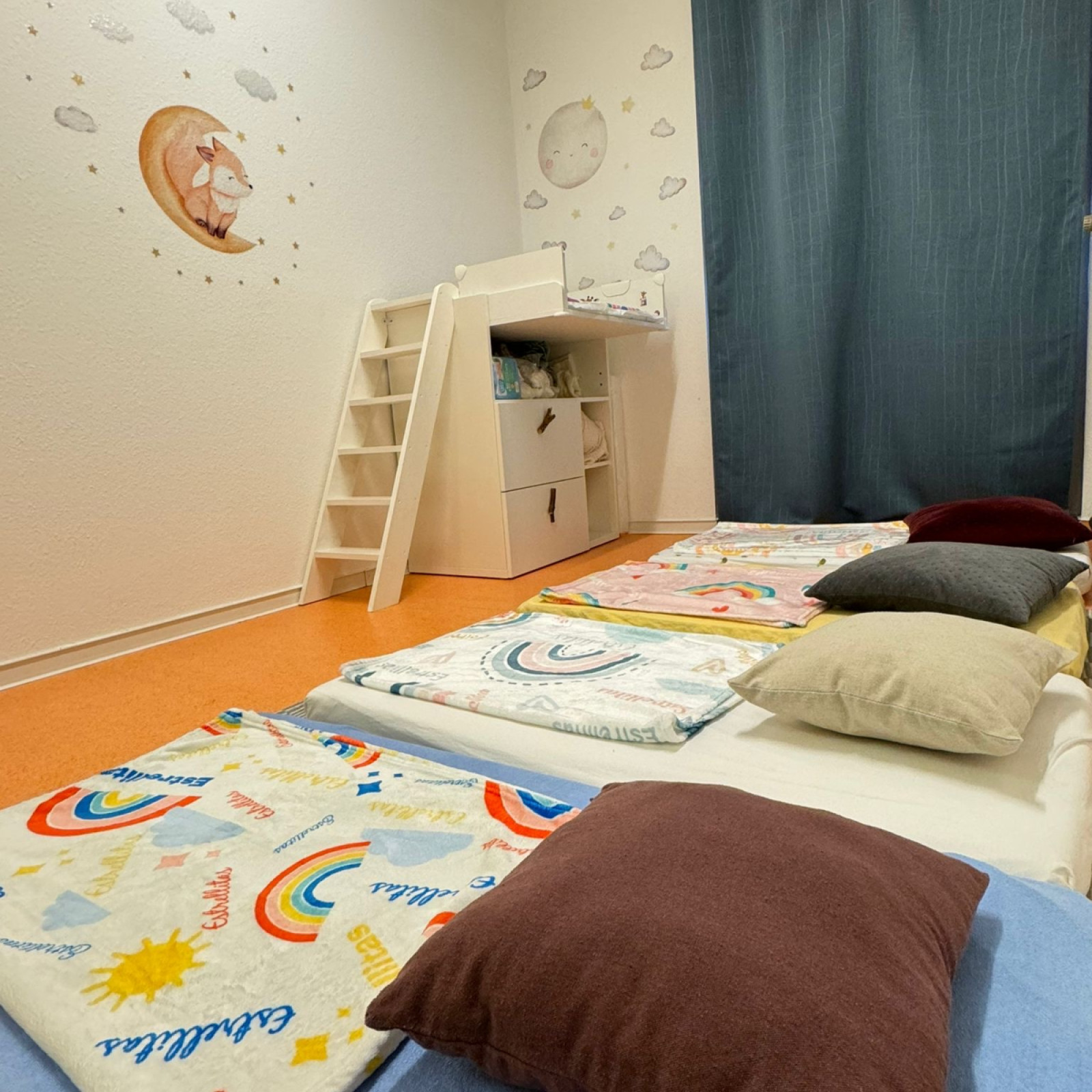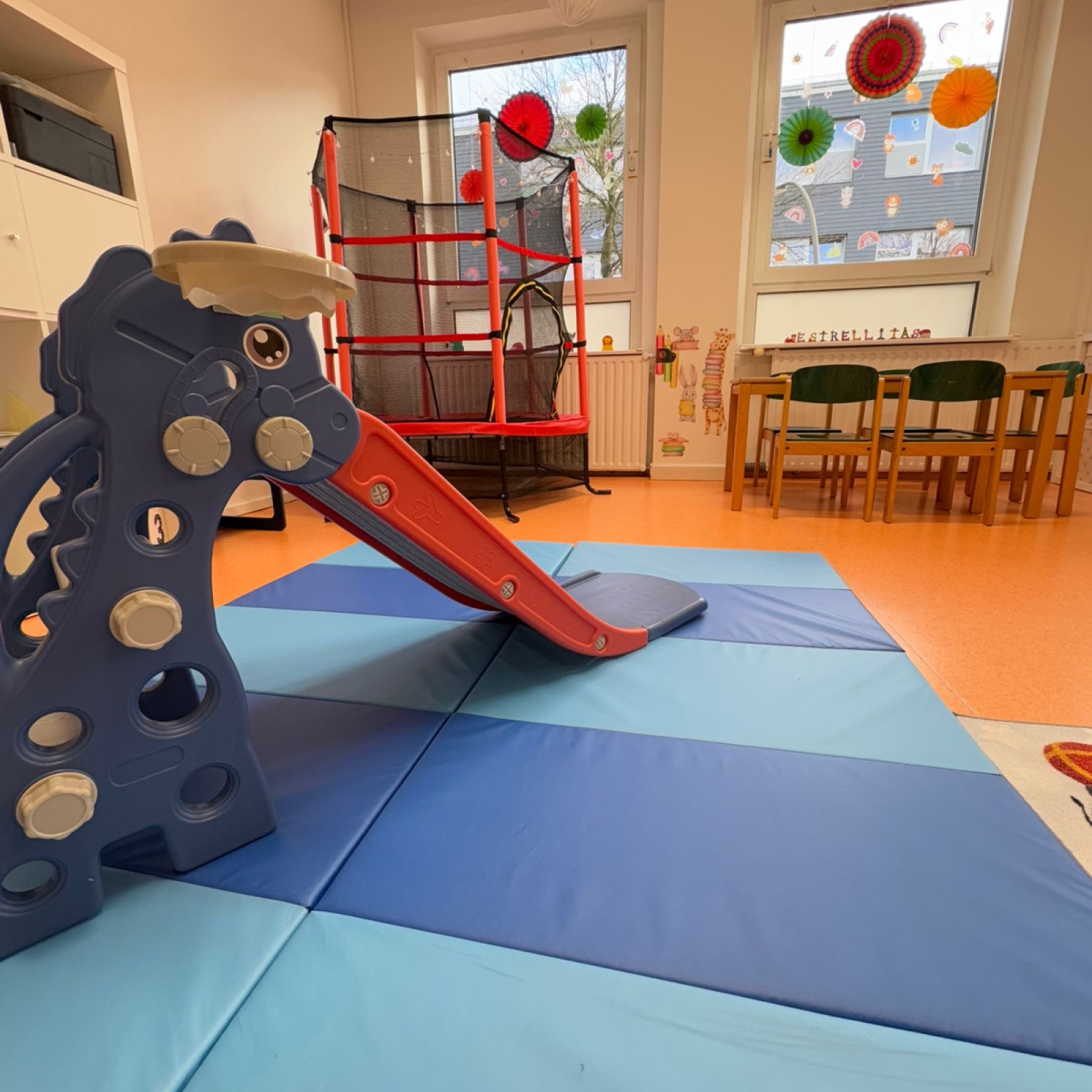 Unsere Räumlichkeiten bestehen aus drei Bereichen: einem Ess- und Bastelraum, einem Schlafraum und einem großen Bewegungsraum, der in zwei Bereiche unterteilt ist. Einen für die Krippe und einen für die Elementargruppe. Zusätzlich verfügen wir über zwei Badezimmer: eines ist exklusiv für die Kinder, während das andere dem Personal zur Verfügung steht. Außerdem haben wir eine Küche und einen Eingangsbereich mit Flur.