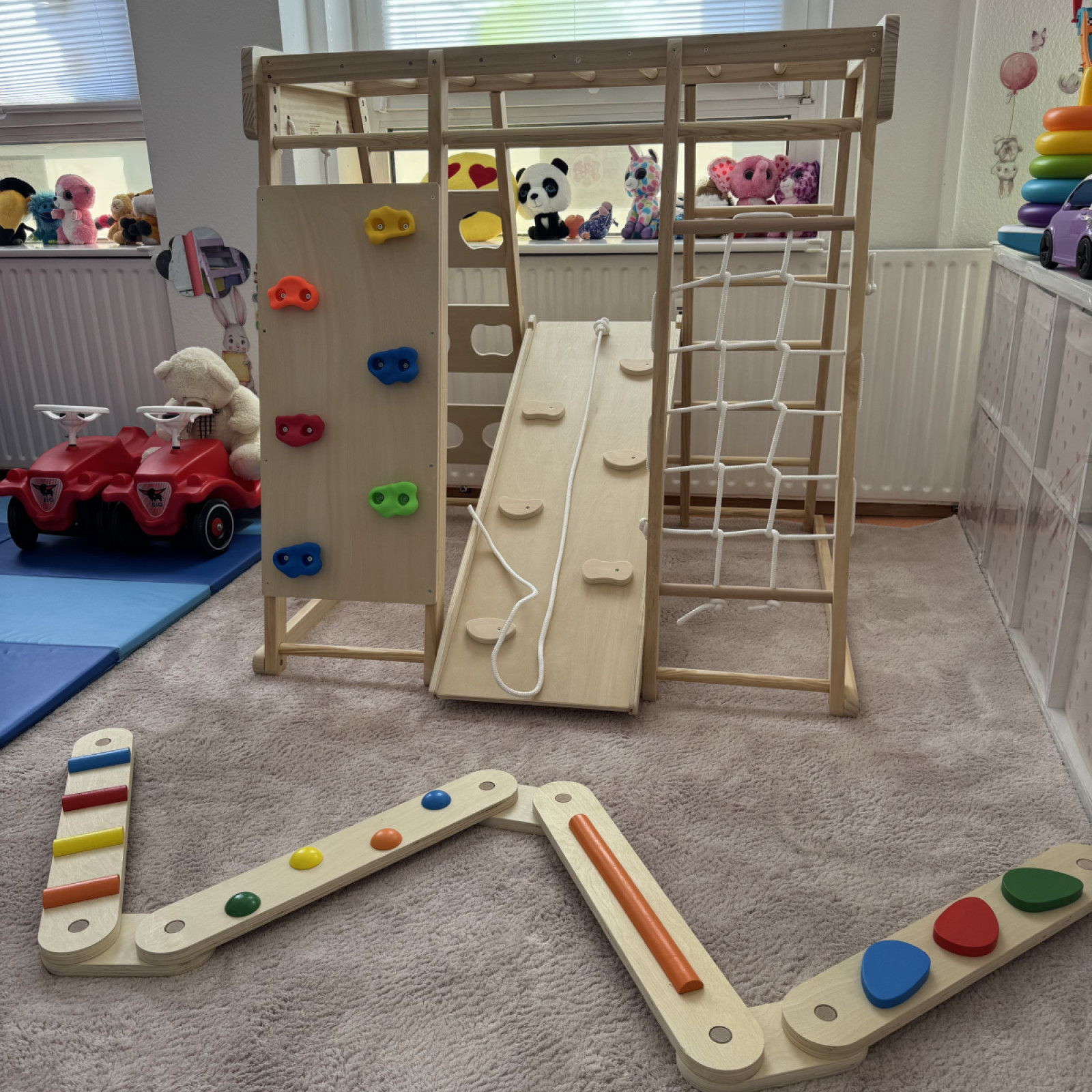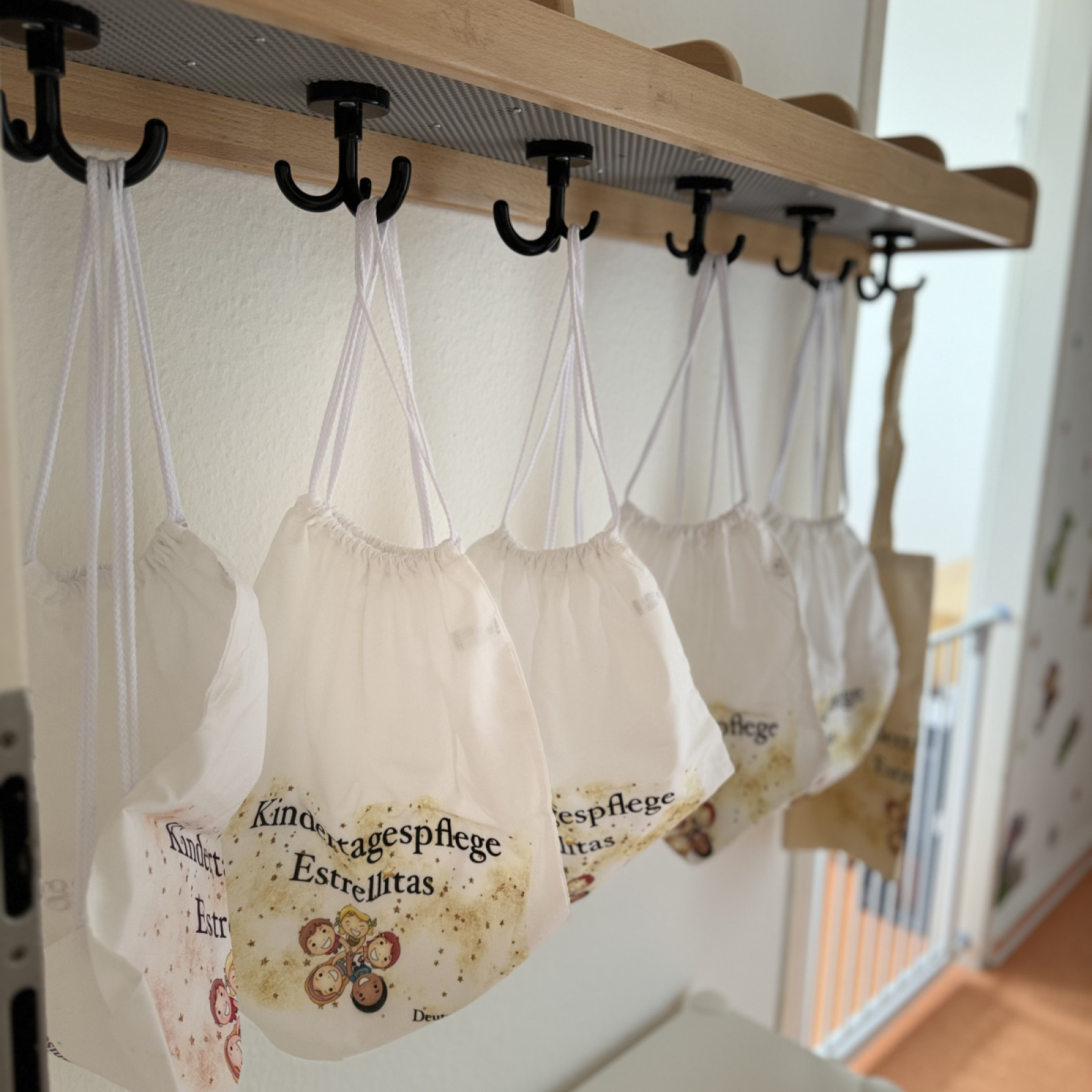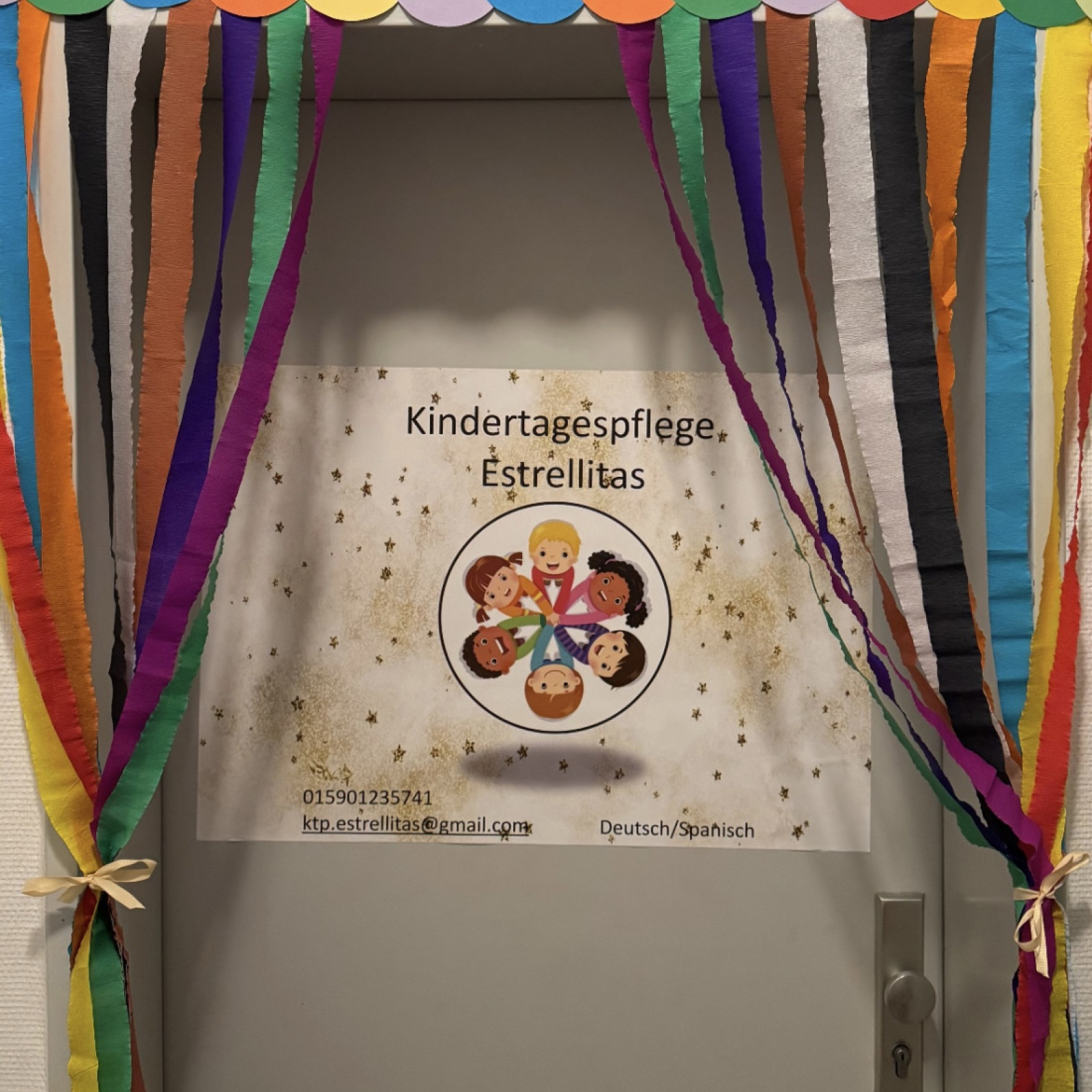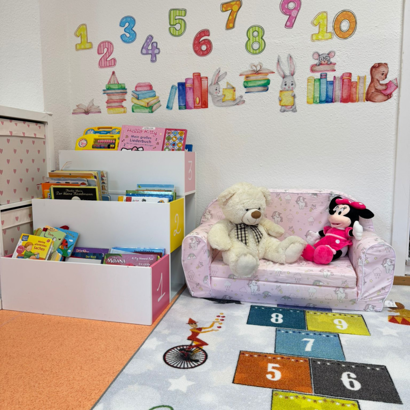 Unsere Räumlichkeiten bestehen aus drei Bereichen: einem Ess- und Bastelraum, einem Schlafraum und einem großen Bewegungsraum, der in zwei Bereiche unterteilt ist. Einen für die Krippe und einen für die Elementargruppe. Zusätzlich verfügen wir über zwei Badezimmer: eines ist exklusiv für die Kinder, während das andere dem Personal zur Verfügung steht. Außerdem haben wir eine Küche und einen Eingangsbereich mit Flur.